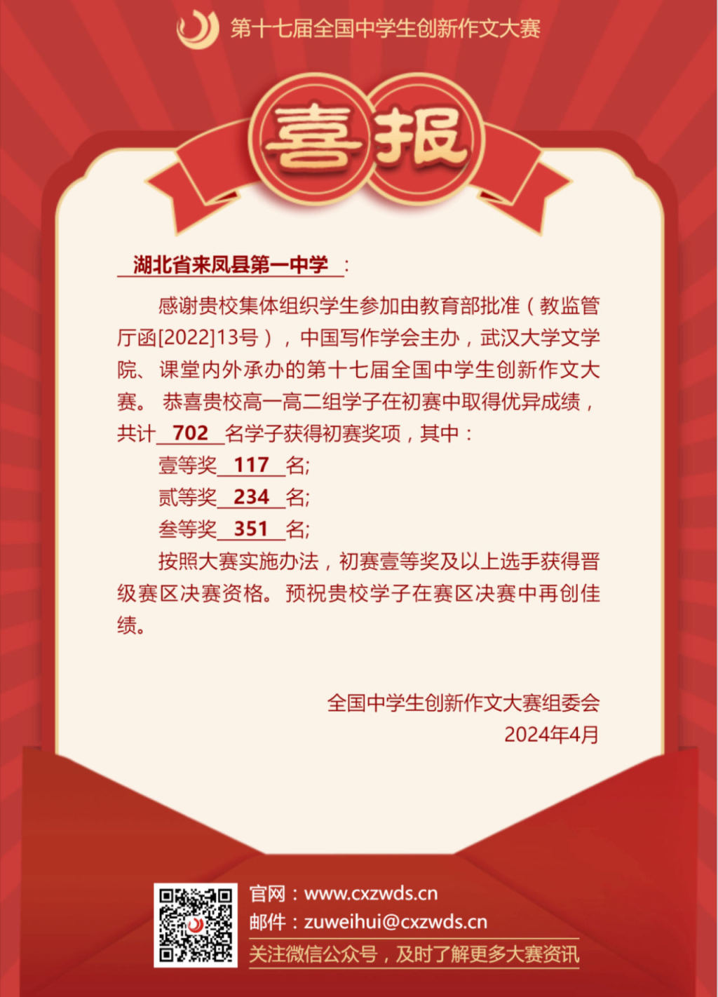 通讯员(田蜜)来凤一中学子在高中生创新能力大赛中喜获佳绩!高中生创新能力大赛是一项针对高中生创新潜质发掘和评价的竞赛活动,由中国老教授协会主办,每年举办一届。...