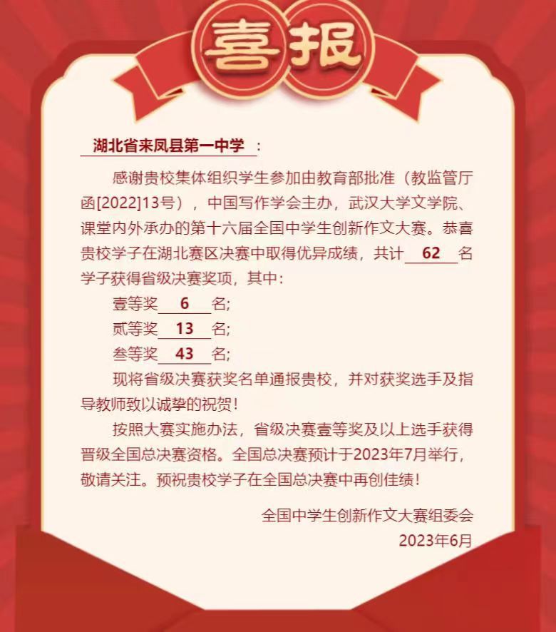 近日,我校学生参加由教育部批准,中国写作学会主办,武汉大学文学院、课堂内外承办的第十六届全国中学生创新作文大赛,在湖北赛区决赛中取得优异成绩,共计62名学子获...