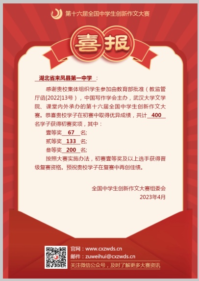 近日,我校学生参加由教育部批准,中国写作学会主办,武汉大学文学院、课堂内外承办的第十六届全国中学生创新作文大赛,在初赛中取得优异成绩,共计 400名学子获得初赛奖...